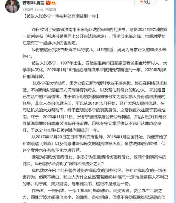 2019年5月从日本回国就被抓的安徽淮南女漫画师张冬宁被以寻衅滋事罪,判刑1年,于2020年5月8日第一次刑满出狱。但当年11月11日她再度被抓,前不久再次以寻衅滋事罪被判1年,刑期至2021年11月10日。张冬宁第一次被抓原因是辱习、辱华,第二次被抓看起来与她就江歌案的发言有关。