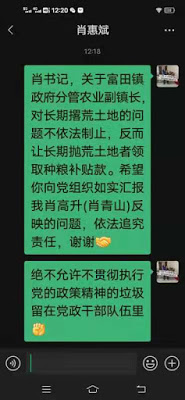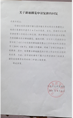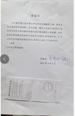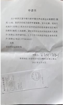 (维权网信息中心报道)2021年4月10日,本网获悉:过了春节后,江西省原“新黑五类”肖青山,见自己所在的吉安市富田镇大量农田被抛荒十分心疼,就给富田镇的政法书记肖惠斌发短信,要求尽快复耕,见肖书记不予理睬,就向吉安市自然资源局写信反映,要求责令恢复耕地的种植。
