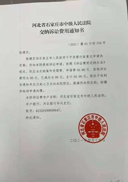 当天下午,石家庄中院通知张建芝已经找到三件行政起诉状,并决定予以立案。张建芝通过银行转账,当即缴纳了诉讼费,该院出具了统一票据(电子)。