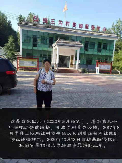 (维权网信息中心报道)2021年4月18日,本网获悉:河南省洛阳市嵩县田湖镇腾王沟三组的张素珍,因为信访举报集体土地被非法征用,村干部涉嫌侵占集体财产等,遭到当局以“寻衅滋事罪”判刑,张素珍在走出冤狱后,一方面继续固定地方政府违法的证据,并指扫黑除恶运动是粉饰暴政的摆设!