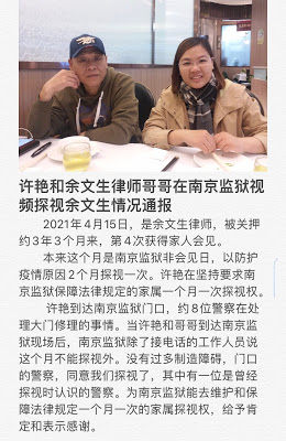 许艳:许艳和余文生律师哥哥在南京监狱视频探视余文生情况通报(2021年4月19日星期一)