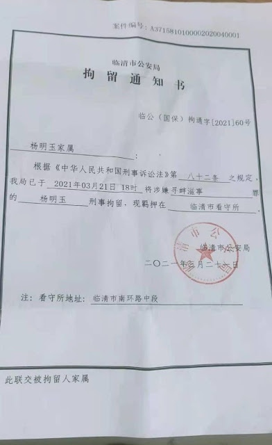 (维权网信息中心报道)2021年4月24日,本网获悉:山东省聊城临清维权人士杨明玉于2021年3月21日被以涉嫌寻衅滋事罪遭山东临清市警方刑事拘留。