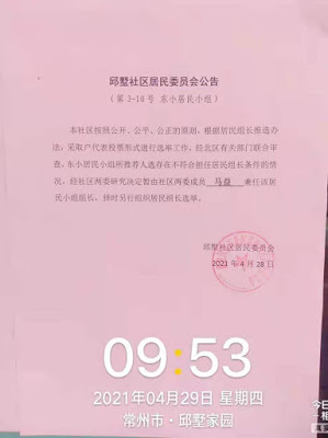 (维权网信息中心报道)2021年4月30日,本网获悉:2021年4月29日,江苏省常州邱墅社区居民委员会发布《公告》(第3-10号 东小居民小组),载明:“经北区有关部门联合审查,东小居民小组所推荐人选存在不符合担任居民组长条件的情况,经社区两委研究决定暂由社区两委成员马益兼任该居民小组组长,择时另行组织居民组长选举。”这里的所谓“联合审查”,其实质就是“政审”。马益系邱墅社区居委会主任,以“政审不合格”为由,剥夺了周志龙的被选举权,又自己兼任该社区东小组组长。