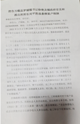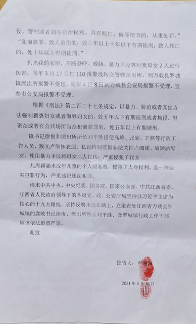 2021年3月3日,原告带13岁的女儿周颖涵去北京看病时,在北京市公安局附近,无故被罗城镇政府工作人员殴打,扒光衣服,然后,绑架到万载县罗城镇政府黑监狱里非法关押14天后放出,原告立即打110报警,被告接到报警后,拒不出警。为此,依法起诉!