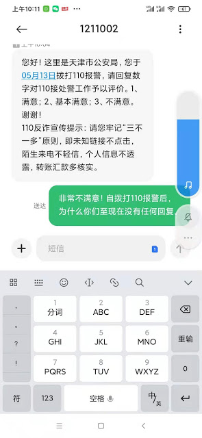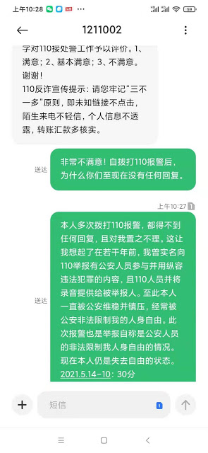 今天上午10点十分左右,天津市公安局还矫情地给张建中发来短信,询问昨天110出警的处理情况,及对人民警察的出警处理是否满意,还在被稳控中的张建中立即予以回复,告知110没有任何作为,而且今天墙子派出所还在自己暂住地门口对自己实施不法的监视。