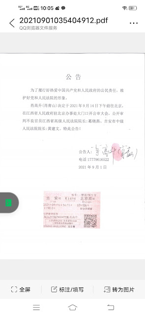 (维权网信息中心报道)2021年9月3日,本网获悉:2021年8月1日,江西维权人士肖青山在吉安市中级法院微信公众号发出第一号公告,准备9月29日进京“批斗”中级法院的院长黄建文。因为受到国保的指责,肖青山又发出第二号公告,将时间提前到9月16日,将“批斗”改为“公审”,同时将省高院的院长也列入了“公审”对象。