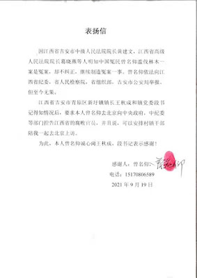 (维权网信息中心报道)2021年9月20日,本网获悉:被以“滥伐林木罪”判刑三年六个月而一直在伸冤的曾名仰,因不满吉安市中级法院院长与江西省高级法院院长的不作为,多次向纪委监察委、及组织部控告,见曾名仰屡告屡败,其所在的新圩镇领导告知曾名仰应该去北京。对此,曾名仰以“表扬信”方式表达感谢。