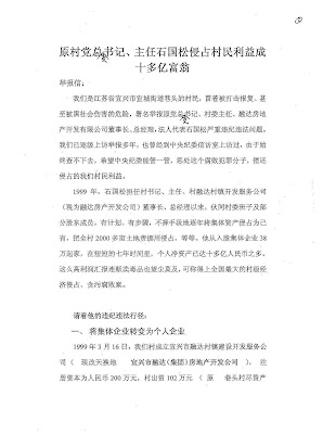 我们是江苏省宜兴市宜城街道巷头的村民,冒着被打击报复、甚至被黑社会伤害的危险,署名举报原党,总支书记、村委主任、融达房产开发有限公司董事长、总经理,法人代表石国松严重违纪违法问题。
