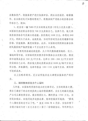 综上所述,石国松涉案金额特别巨大,生活作风极为糜烂,已严重地侵害了人民群众的根本利益,严重地影响了党员及党员干部在人民群众心目中的形象。石国松一日不被法办,就会继续危害社会,我们巷头村村民坚决不答应。为此恳请中央纪委领导批示地方纪委和司法机关对群众的举报予以从速立案调查。