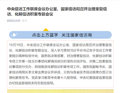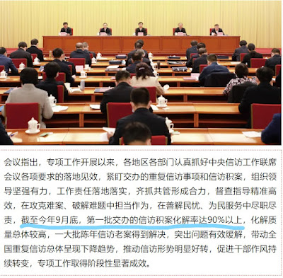 (维权网信息中心报道)2021年10月23日,本网获悉:2021年10月19日,国家信访局发布了“中央信访工作联席会议办公室、国家信访局召开治理重复信访/化解信访积案专题会议”,称根据贯彻落实总书记对信访工作重要指示精神,截至到今年的九月份,第一批交办的信访积案化解率达90%以上。该信息的发布,引起信访人的哗然,纷纷对该数据表示质疑。