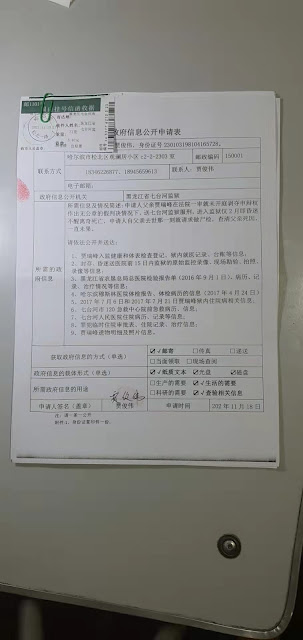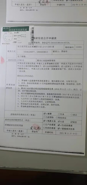 (维权网信息中心报道)2021年12月10日,本网获悉:今天是世界人权日,也是黑龙江维权人士贾俊伟向七台河监狱提交申请,要求公开其父亲贾俊伟死亡的医疗信息超过20天期限的时间,但七台河监狱尚未履行政府信息公开的法定职责,及时依申请公开相关信息,来证明自己没有过错。