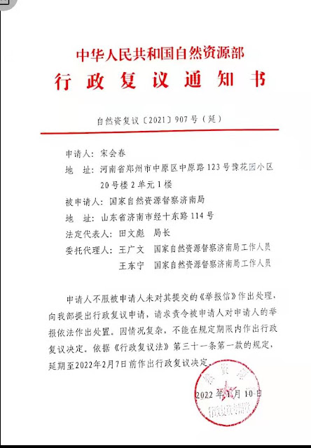 (维权网信息中心报道)2022年1月12日,本网获悉:今天,宋会春收到国家自然资源部作出的自然资复议【2021】907号(延)《行政复议通知书》,称“因情况复杂不能在规定时间内作出行政复议决定,依据《行政复议法》第三十一条第一款规定,延期至2022年2月7日前作出行政复议决定。”