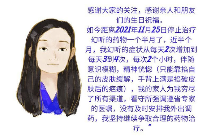 据悉:自去年11月25翘楚被迫停止治疗幻听的药物已经一个半月。近半月来,翘楚幻听的症状人每天2次增加到每天3到4次,每次2个小时,伴随意识模糊,精神恍惚。就治疗问题律师与家属已经与公安机关交涉尽快安排,家属申请取保候审再次被口头拒绝。