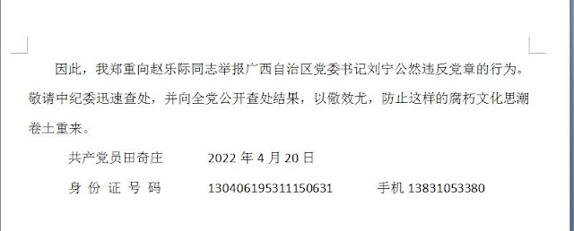 因此,我郑重向赵乐际同志举报广西自治区党委书记刘宁公然违反党章的行为。敬请中纪委迅速查处,并向全党公开查处结果,以儆效尤,防止这样的腐朽文化思潮卷土重来。