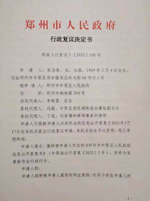 (维权网信息中心报道)2022年5月1日,本网获悉:2022年4月29日,郑州市人民政府向宋会春送达郑政(行复决)【2022】108号行政复议决定书,载明:“撤销被申请人作出《郑州市中原区人民政府信息公开答复书》(中原政公开答复(2022]2号)的行为,责令其依法重新作出处理。”郑州市政府责令中原区政府重新作出处理,无疑是正确的。