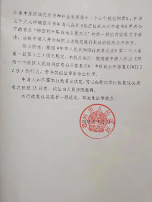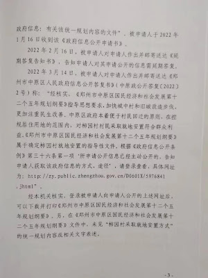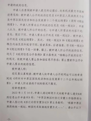 2022年3月14日,中原区政府终于向宋会春送达《郑州市中原区人民政府信息公开答复书》(中原政公开答复[2022〕2号)称:“经核实,《郑州市中原区国民经济和社会发展第十二个五年规划纲要》指导思想要求,加快城中村和旧城改造步伐,更加注重民生改善。中原区政府本着便于村民回迁的原则,在控规居住用地的范围内,对柿园村村民采取就地安置符合群众利益。《郑州市中原区国民经济和社会发展第十二个五年规划纲要》属于确定柿园村就地安置的指导性文件……”。中原区政府未提供《规划纲要》,只提供了查找该《规划纲要》的网址。