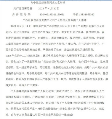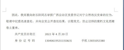 附:田奇庄实名举报信:向中纪委赵乐际同志实名举报——广西壮族自治区党委书记刘宁公然违反党章搞个人崇拜