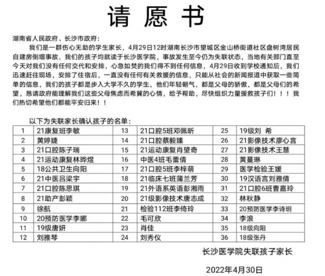 此次事故可谓触目惊心,另外,还有一群更值得关注的人。4月30日,一份《请愿书》和家长公布36名学生失联名单在社交媒体流传。这份落款为“长沙医学院失联孩子家长”的网传《请愿书》内容显示,他们的孩子均就读于长沙医学院,事故发生至今仍为失联状态,当地有关部门一直没有对他们有任何交代和安排。他们希望孩子能平安归来,希望知道救援的过程和得到公开的相关信息。