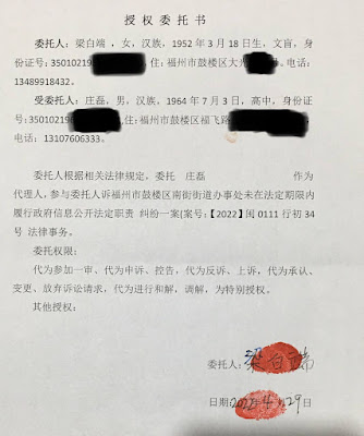 梁白端对于三坊七巷社区如此严重的违法行为,非常愤怒,72岁高龄,几近文盲,无法独立开庭,还没进法院,就先遭所在社区侵权,剥夺其委托代理权利。