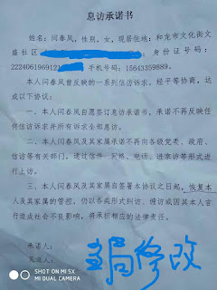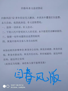 正因为不幸接二连三,闫春凤到和龙市信访局又遭到阻止,遂提出“以零元息访换取人身安全”,并向当局提交了书面的息访协议书草稿。和龙市信访局收到闫春凤的息访草稿后,进行了修改,其中第三条“豪横”地明确:闫春凤和家属签署息访协议后,将恢复对闫春凤凤家属的管控。