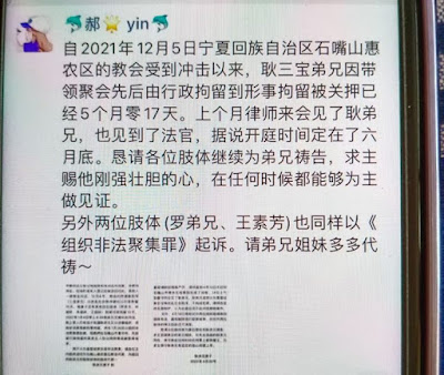 (维权网信息中心报道)2022年6月8日,本网获悉:宁夏石嘴山市惠农区磐石教会耿则军传道案将于2022年6月底开庭。