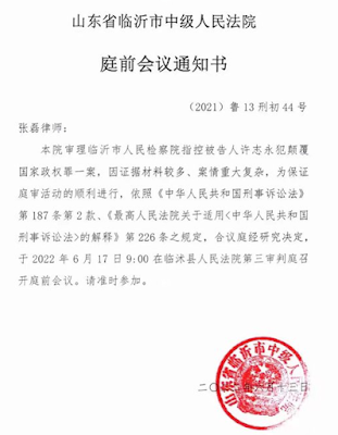 (维权网信息中心报道)2022年6月14日,本网获悉:著名人权捍卫者许志永案庭前会议将于2022年6月17日召开。同案的丁家喜律师案庭前会议将于6月20日召开。