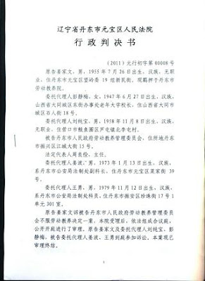 辽宁省丹东市元宝区法院从“党的利益至上”的政治高度,就姜家文诉丹东市劳教委一案作出了(2011)元行初字第0008号行政判决书,驳回了冤民姜家文声声泪、字字血的诉讼请求,“以法”维持了丹东市劳教委颠倒黑白的(2011)第36号劳教决定书。