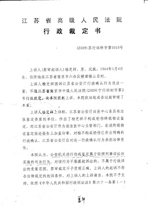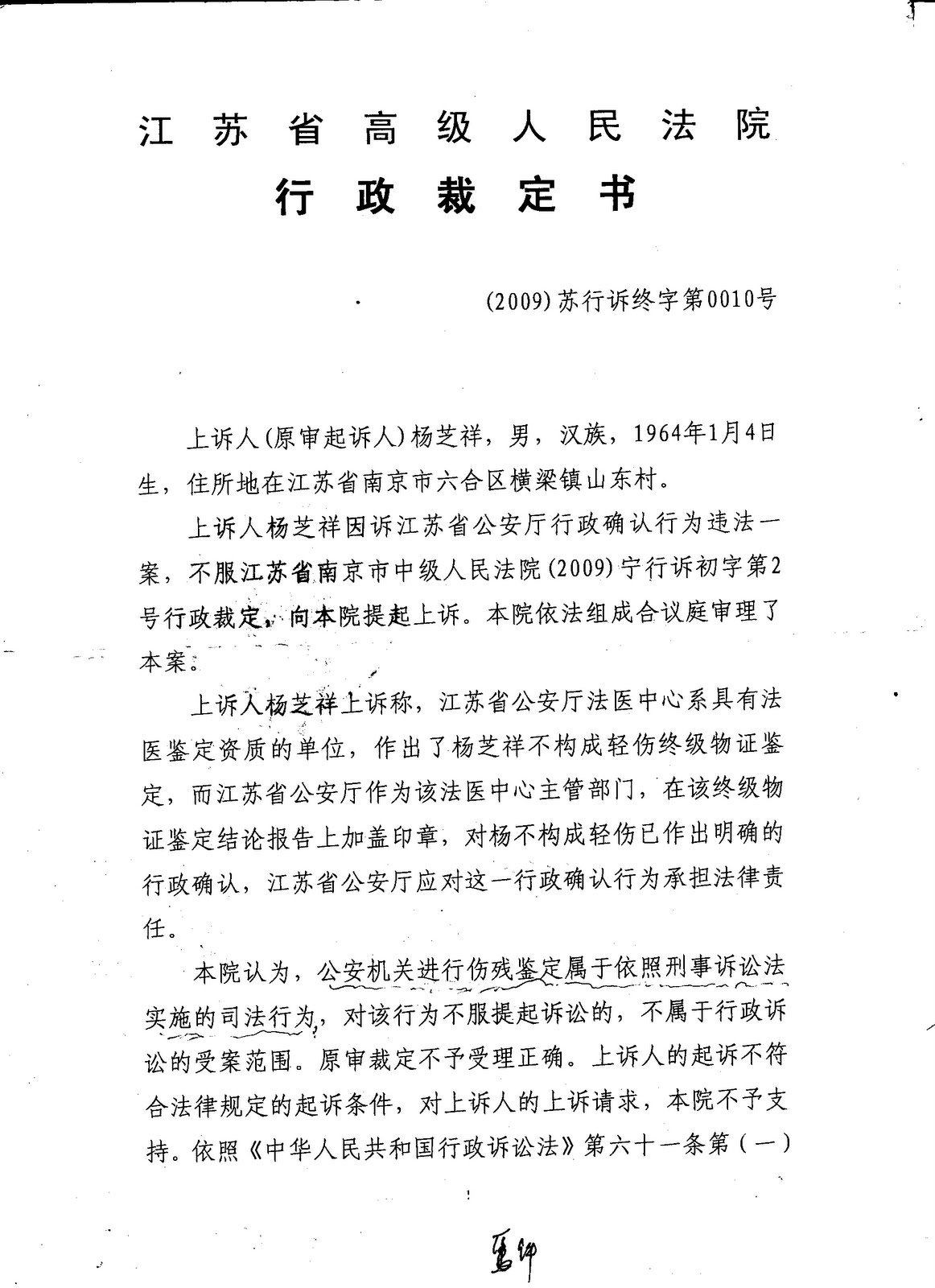 已经失去生活自理能力的杨芝祥不服江苏省公安厅的枉法鉴定,向南京市中级法院提起行政诉讼,南京市中级法院以“公安机关依刑事诉讼法实施的司法鉴定不属于行政行为”为由,裁定驳回杨芝祥的行政起诉。驳回裁定的杨芝祥上诉到江苏省省高院,江苏省省高院作出(2009)苏行诉终字第0010号裁定书,裁定驳回上诉,杨芝祥遂到最高法院申诉再审。