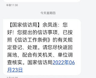 余凤连反映的是工作的问题,父亲山林被侵占的问题、自己和兄弟余仿堂因为上访身份证被录入“黑五类贱民”信息问题,及2020年10月因为身份证信息遭截访而被刑事迫害事件。余凤连是今年4月份由炮制冤假错案的公安机关解除取保候审后,才再次进京信访的,地方上还专门派了社区书记等,陪同受尽冤屈的余凤连进京。
