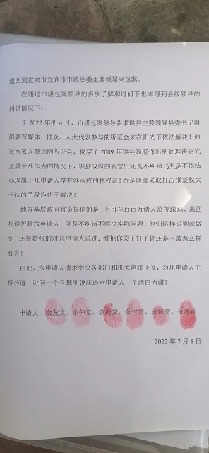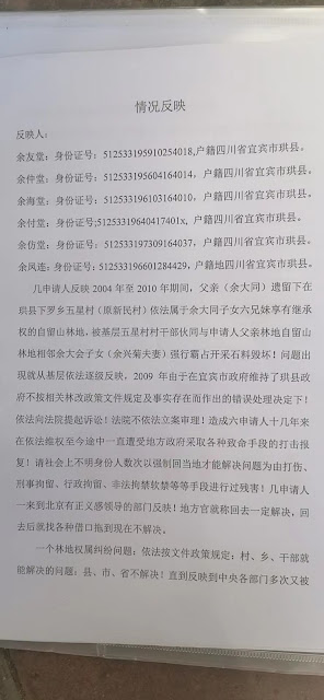 余仲堂、余友堂、余海堂、余付堂、余仿堂、及余凤连等六兄妹反映的是父亲山林被侵占的问题,及在上访后身份证被录入“黑五类贱民”信息问题,以及2020年10月余凤连因为身份证信息遭截访而被刑事迫害事件。余凤连是今年4月份由炮制冤假错案的公安机关解除取保候审后,才再次进京信访的,地方上还在新的信访工作条例施行后,专门派了社区书记等,陪同受尽冤屈的余凤连进京。
