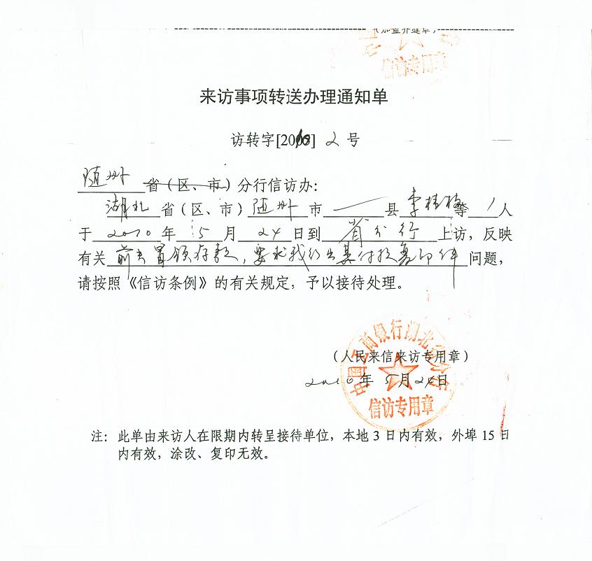 湖北省广水市韩家岗的李桂芝,因追讨被他人窃取的近12万元存款,于9月19日上午到广水市政府找领导,结果被强行送到广水市中华山金田山庄黑监狱关押。9月21日,广水市公安局的黄局长和张局长一行5人拿着一张以“李桂芝扰乱公共秩序”为由的劳动教养聆讯告知书,恐吓李桂芝如不签停访息诉书就送劳教所教养2年,李桂芝被迫签字。