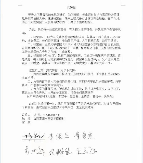 (维权网信息中心报道)2022年7月15日,本网获悉:据山西临汾金灯台杨荣丽传道的大哥杨凯(TEL:13546388814)今天的代祷信:杨荣丽今年67岁,患有严重的糖尿病,而她这种糖尿病不是糖高,而是缺糖,需长期每日定时服用特效降糖药,拘留所没有这种药,又不让家属送, 更无法看望。其他同工身体也都出现不同程度状况,甚至每天吃不饱。请求代祷并欢迎媒体采访。