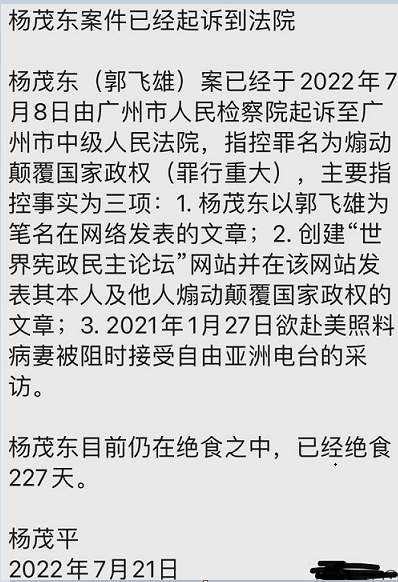 杨茂东(郭飞雄)案已经于2022年7月8日由广州市人民检察院起诉至广州市中级人民法院,指控罪名为煽动颠覆国家政权(罪行重大),主要指控事实为三项: