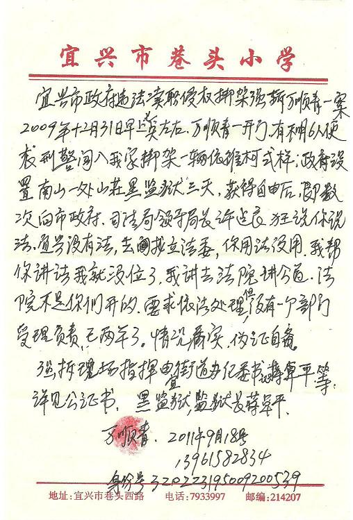 我从黑监狱出来获得自由后,数次到市政府讨说法,司法局局长许建良狂妄地说:你要讲法,你去找立法委,宜兴没有法,你讲法没用,我要帮你,我就保不自己的官位了。我说:去法院讲公道。他说:法院又不是你们开的。我要求依法处理,事情已过去近两年了,但没有一个部门负责受理。以上情况属实,如作伪证,后果自负。