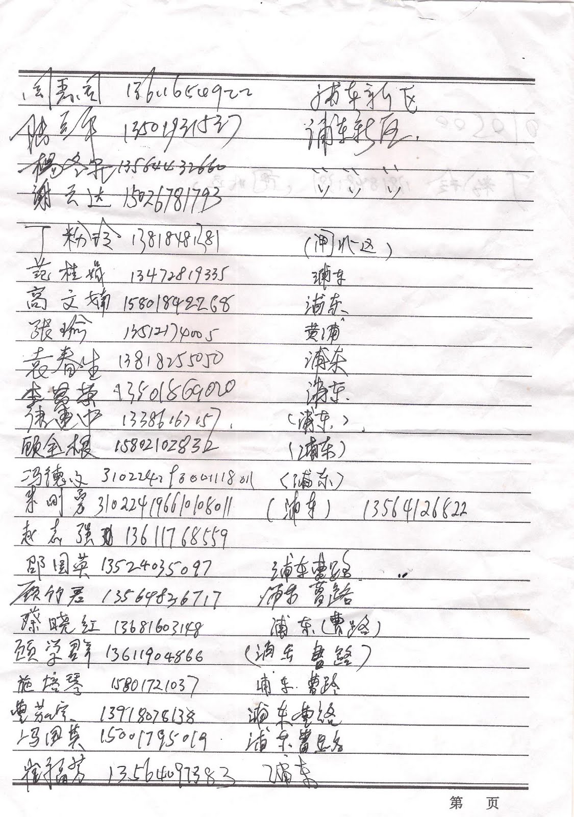 附访民给权利运动发来的信息:今天是2011年9月16日星期五上午九点多左右上海市浦东新区有朱金娣,卫玉华,徐秋琴萤苏华.谢金华董,将近四十几名维权人士,到浦东新区看守所门前为九月九日去京维权回沪后遭到打压,被关进看守所出犾的维权人士接铎,被关押人员;有丁菊英,申琴芳,周菊仙,傅宇,金美珍,沈仙,俞联群,徐雪芬,万晓红,等还有一位叫朱金安的老人不愿出来,他法律很强,因看守所警察不绐他释放证,所以老人不愿出来.后我们所有维权人士都走了,老人后面的情兄我们不知道,请大家关主!下午我们二点左右又来到浦东法院要求立案,浦东法院的法官还是不给立案.望各界有识人土,法律专家,媒体,关注我们这些失去家园和土地的寃民。