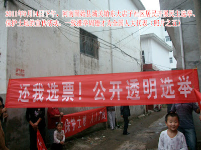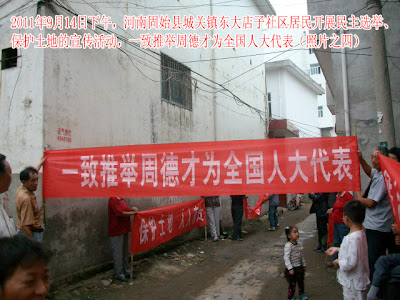 失地农民深受腐败之苦难,告状无门、上访无路,怎么办?河南省固始县城关镇东大子社区的失地农民通过学习国家《宪法》和《选举法》发现,原来自己的权利一直被“代表”,官员的不法行为得不到有效监督和问责。觉醒的老百姓于2011年9月14日自发举行全国人大代表公推公选的宣传活动,希望敢于为老百姓依法维权的周德才先生当选为全国人大代表。