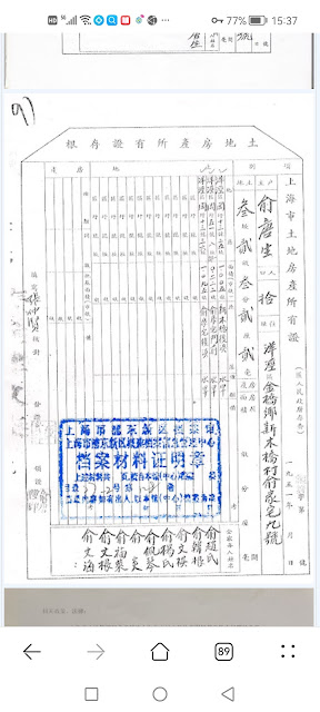 2、《上海市土地房产所有证》(俞家宅9号,俞唐生为户主,全家户口报在该房);