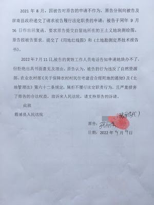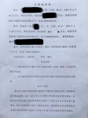 (维权网信息中心报道)2022年9月15日,本网获悉:宁德维权人士张丽芳已向宁德市霞浦县法院提交其起诉被告屏南县棠口镇当局拒不履行审批宅基地法定职责的《行政起诉状》和相应证据,诉请法院:1.确认被告拒不履行农村宅基地审核、批准(报批)法定职责的行为违法;2.判令被告依原告申请在法定权限内履行宅基地审批的法定职责。
