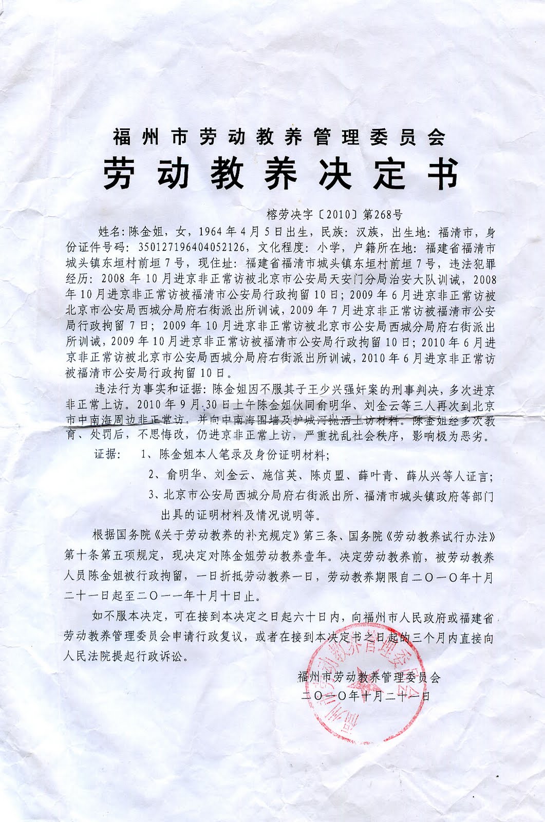 在福州市劳教委作出的榕劳决字[2010]第268号劳动教养决定书中,福州市劳教委称,陈金姐因不服其子王少兴强奸案(判决书认定是4人轮奸)的刑事判决,从2008年10月开始多次到北京非正常上访,依据国务院《关于劳动教养的补充规定》第三条和国务院《劳动教养试行办法》第十条第五项规定,决定对陈金姐处以劳动教养一年。