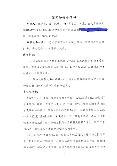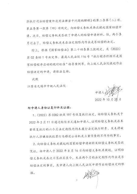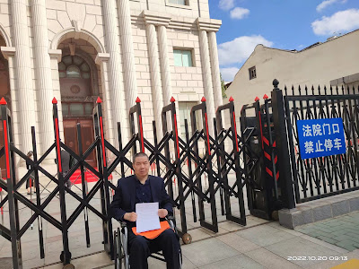 10月20日上午,人权捍卫者张建平赴无锡市中级人民法院,就宜兴法院在其已长达25年的人身损害赔偿案件中,执行中不履行法定执行职责行为,第二次提交申请作出国家赔偿决定的材料。