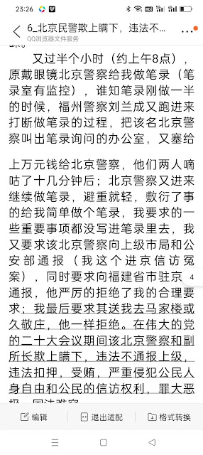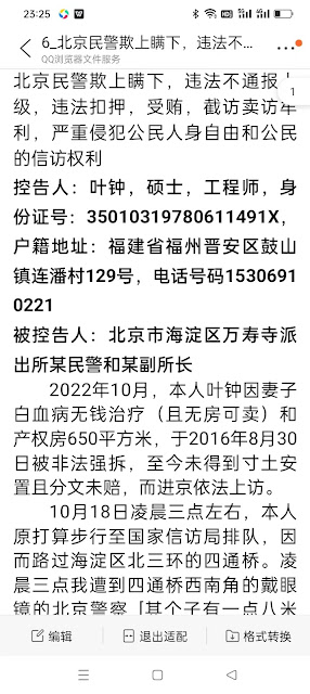 (维权网信息中心报道)2022年11月20日。本网获悉:就自己在中共“二十大”期间被北京公安扣押,并移送福州维稳截访专班押回非法拘禁事件,福州市的硕士访民叶钟于2022年11月16日给公安部、国家信访局、中央纪委等官方网站投诉,控告北京公安警察参与卖访的违法行为。