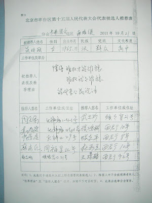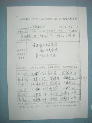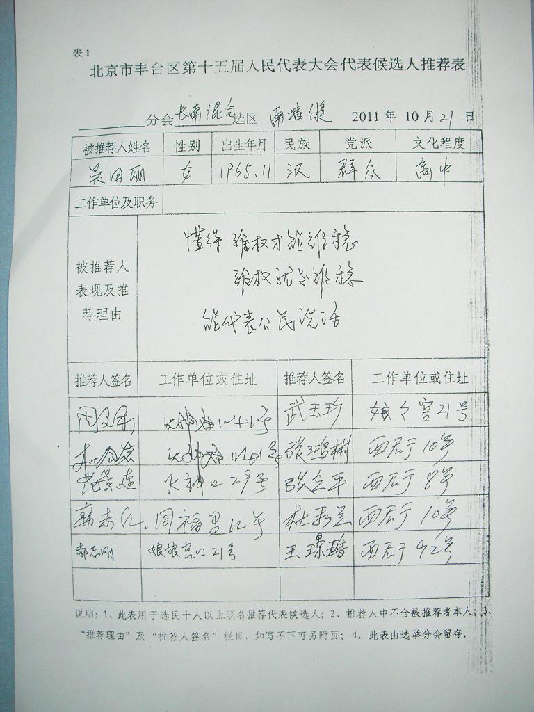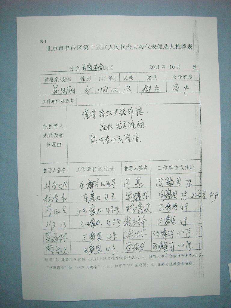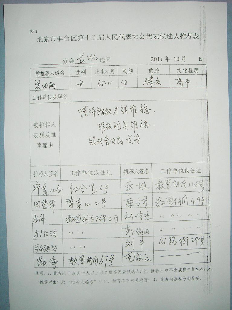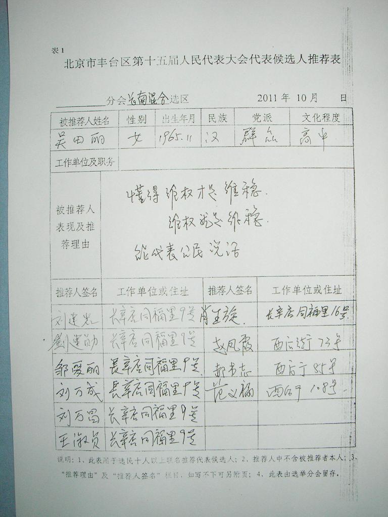 2011年10月21日星期五,北京市丰台区长辛店街道选区的董金钟、郝德祥、宁金鹏、王秀云等选民代表来到长辛店街道办事处,将由76位选区选民认真负责填写的、推选吴田丽为人大代表候选人的表格向选区办公室递交。