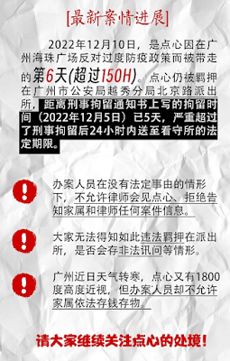 今日最新获悉案情杨紫荆的案情进展是:2022年12月10日,是杨紫荆因在广州海珠广场反对过度防疫政策,而被带走的第6天(超过150小时)。其仍被羁押在广州市公安局越秀分局北京路派出所,距离刑事拘留通知书上写的拘留时间(2022年12月5日)已5天,严重超过了刑事拘留后24小时内送至看守所的法定期限。办案人员在没有法定事由的情形下,不允许律师会见、拒绝告知家属和律师任何案件信息。大家无法得知如此违法羁押在派出所,是否会存在非法讯问等情形。广州近日天气转寒,点心又有1800度高度近视,但办案人员却不允许家属依法存钱存物。请大家继续关注点心的处境!