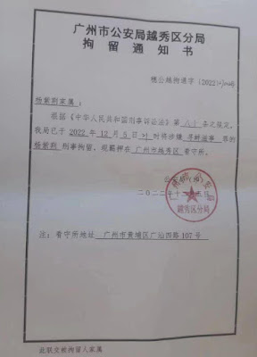 广州女性青年公益行动者杨紫荆(点心),因2022年11月27日晚陪同朋友到广州海珠广场,围观了抗议“动态清零”的群体活动,被广州市越秀区警方秋后算账,以“寻衅滋事”罪被刑事拘留。2022年12月4日晚,广州市越秀区公安分局及下辖的北京街派出所10多个警察、便衣以“查水表”为名骗开杨紫荆家门,在拒绝出示搜查证的情况下强行搜查屋内电子设备。随后借口涉及海珠广场事件,以口头传唤名义将杨紫荆抓走。