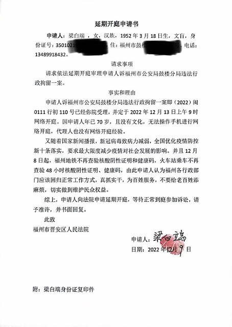 9日,她寄出《延期开庭申请书》,上载:1.因70岁老太太且没有文化,无法操作手机进行网络开庭,代理人也没有网络开庭经验。2.随着国家新闻播报,新冠病毒致病力减弱,全国优化疫情防控新十条落实,要求最大限度减少疫情对社会发展的影响。并且12月8日起,福州地铁不再查验核酸阴性证明和健康码,火车站乘车不再查验48小时核酸阴性证明、健康码,由此认为福州各行政部门应该回归正常工作方式,依法行政,不要给老百姓添麻烦,切实做到维护民众权益。于是向法院申请延期开庭,等待正常到庭参加诉讼,请予准许,并书面回复。