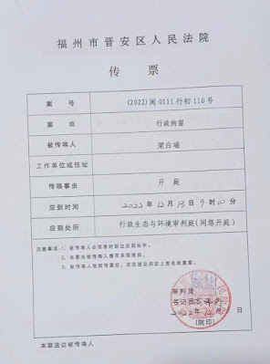 (维权网信息中心报道)2022年12月13日,本网获悉:福州残障维权人士梁白端诉福州市公安局鼓楼分局违法行政拘留一案原定于今天(12月13日)上午9点网络开庭,今已取消。
