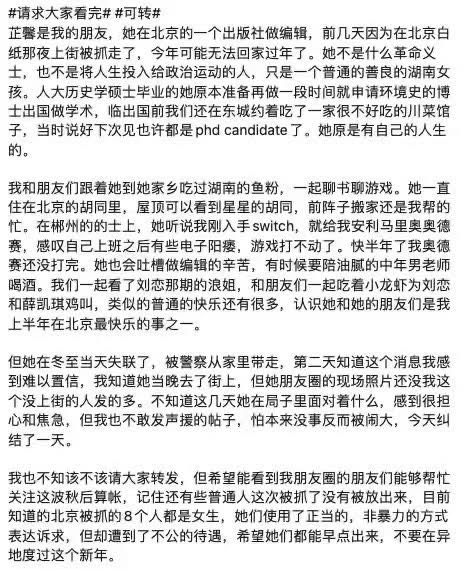 对于所有因参与“白纸抗议运动”而遭抓捕的受难者,本网将持续关注和呼吁。