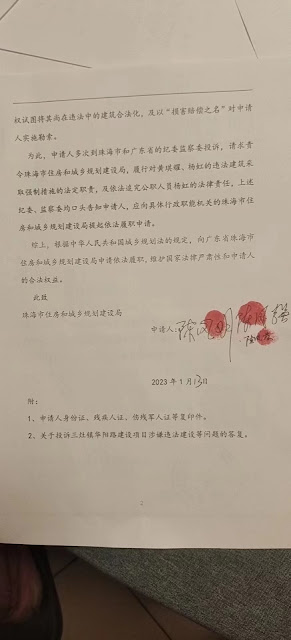 (维权网信息中心报道)2023年1月13日,本网获悉:今天下午,因为珠海市公安女干部杨虹滥用诉权,试图通过民事诉讼由法院作出枉法裁判,达到其违法建筑合法化,及顺便以“损害赔偿”为由实施勒索,被害人陈凤明、陈凤荣、及伤残军人陈风强三位受害者,持已经行政机关确认为违法建筑的材料,向处理违法建筑的职能部门珠海市住房和城乡规划建设局,提交依法履职材料,要求依法对公安女干部的违法建筑履行强制执行的法定职责。