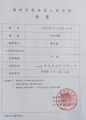 (维权网信息中心报道)2023年1月28日,本网获悉:福州维权人士梁白端诉福州公安违法拘留及诉南街街道不履职案即将于明天开庭。
