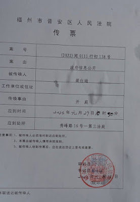 福州残障维权人士梁白端诉:1、福州市公安局鼓楼分局违法行政拘留案。2、诉鼓楼区南街街道办事处不履行信息公开法定职责案。分别于明天(2023年1月29日)上午9点和10点30分在晋安区法院第三法庭开庭,地址:福州秀峰路16号。